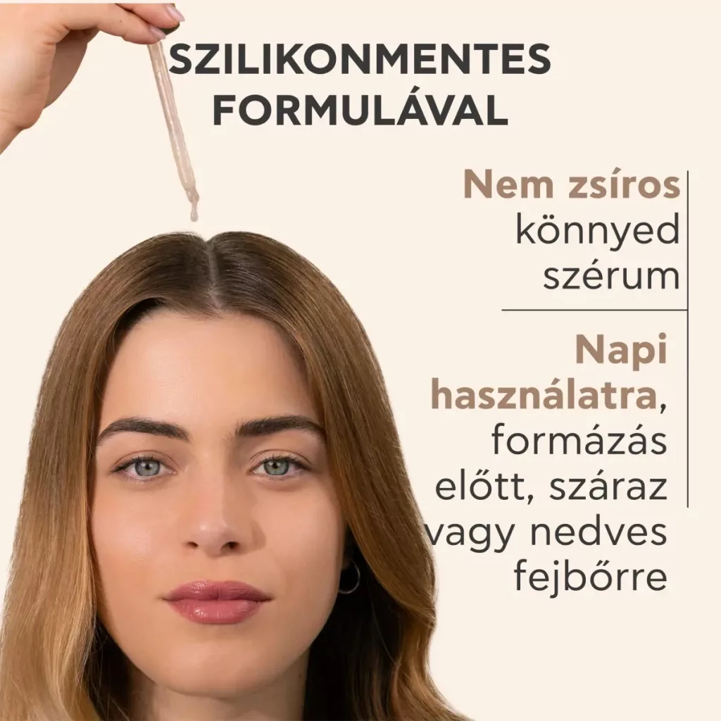A fejbőr hatszor gyorsabban öregszik, mint az arcbőr, az idő előrehaladtával veszít a hajszálakat tápláló és védő funkciójából, ezért a hajszálak vékonyabbá, gyengébbé, törékenyebbé válhatnak. Ez a különleges fejbőr szérum élénkíti a fejbőr működését, táplálja és megszépíti a hajszálakat. A szabadalmaztatott méhpempő-CR mélyen penetrál a fejbőrbe, hogy értékes tápanyaggal lássa el, és megerősítse a hajszálak gyökerét, ezáltal fokozza a haj sűrűségét. Természetes selyem aminosav tartalma bevonja az elvékonyodott hajszálakat, hidratál és volument ad a hajnak. Rendszeres használata klinikailag bizonyítottan növeli a haj sűrűségét (+38,5%)*, revitalizálja a hajat és fejbőrt (81%)**, megerősíti a hajszálak gyökerét (81%)**.